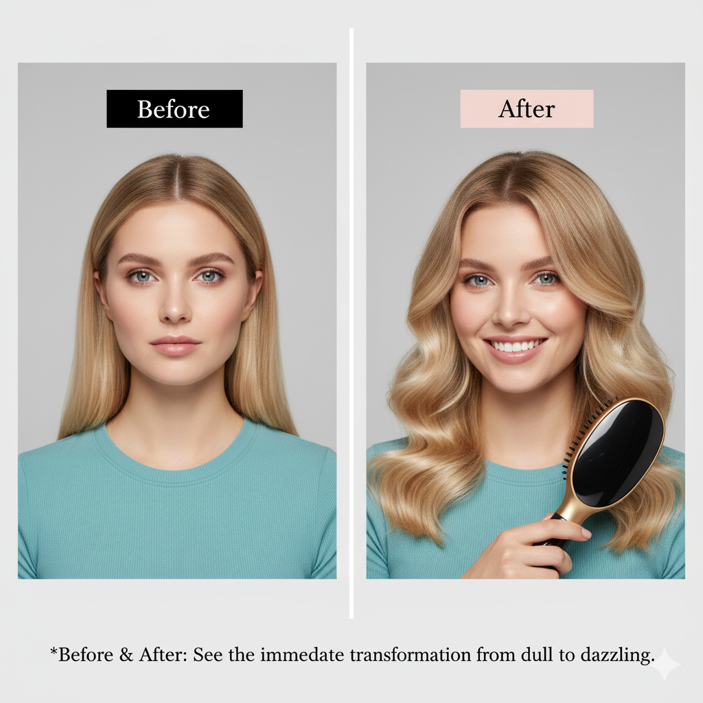 The proof is in the results. On the left, natural hair lacking volume and shine. On the right, effortlessly styled hair with a lasting curl, glossy finish, and noticeable bounce—all achieved with our Thermal Styling Brush. This single tool streamlines your routine, giving you professional results at home, without the salon price tag.